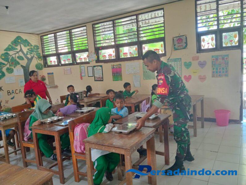 Rote Ndao – Babinsa Koramil 1627-01/Ba’a, Koptu Syahrul Ramadhan bersama Praka M. Feby Athaufiqunafsi melaksanakan pengawalan program Makan Bergizi Gratis (MBG) yang berlangsung di Dapur MBG Kelurahan Metina dan Kelurahan Mokdale, Kecamatan Lobalain, Kabupaten Rote Ndao, pada Jumat (29/8/2025).