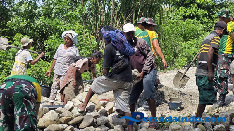 Personel Pos Fohuk bersama warga setempat bekerja sama memperkuat struktur tanggul dengan material yang tersedia agar jalur transportasi tetap aman dan dapat dilalui kendaraan. Jalan Trans Log merupakan akses vital bagi aktivitas masyarakat, terutama dalam distribusi hasil pertanian dan kebutuhan sehari-hari.