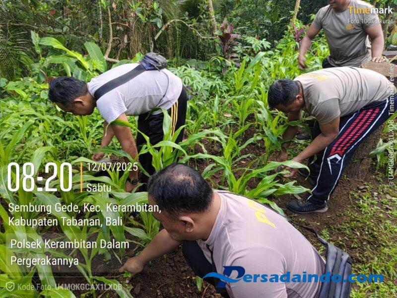 Polres Tabanan-Polsek Kerambitan, Sabtu 12 Juli 2025; Wakapolsek Kerambitan Akp I Ketut Suarcana bersama anggota polsek lainnya melaksanakan perawatan tanaman jagung di Halaman Belakang Polsek Kerambitan.