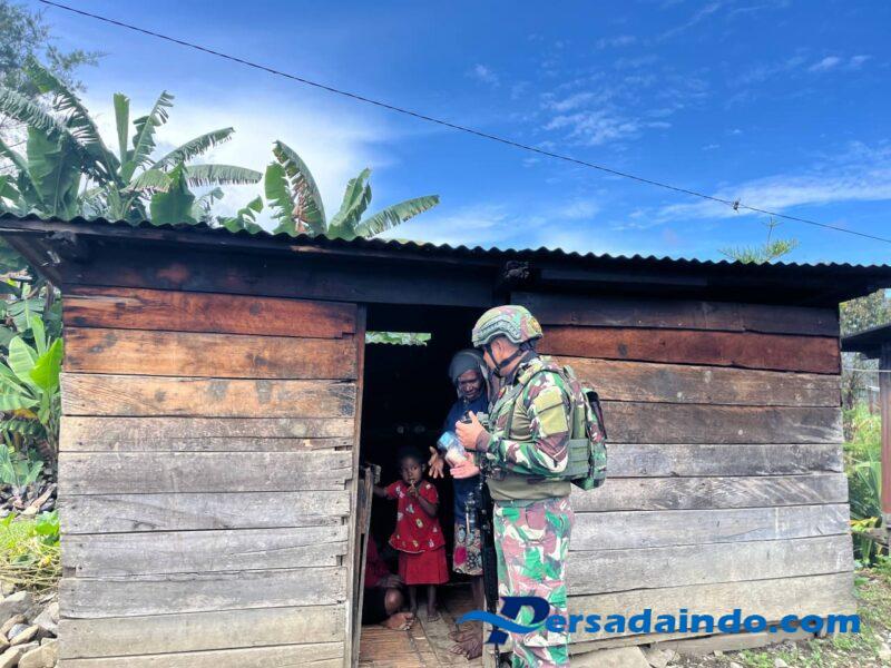 Dengan berjalan kaki menyusuri rumah-rumah warga, para Prajurit Yonif 743/PSY disambut hangat oleh mama-mama dan bapak-bapak yang sudah mengenal mereka seperti keluarga sendiri. Perjumpaan sederhana itu dipenuhi sapaan ramah, canda kecil, dan cerita tentang kehidupan sehari-hari di pegunungan Papua.