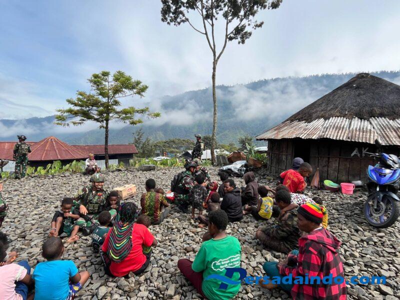 Puncak Jaya, Papua — Prajurit Satgas Yonif 743/PSY melaksanakan kegiatan anjangsana sekaligus berbagi keceriaan bersama anak-anak serta memberikan layanan pengobatan gratis kepada masyarakat di Kampung Pruleme, Distrik Mulia, Kabupaten Puncak Jaya, Papua, Senin (24/11/25).