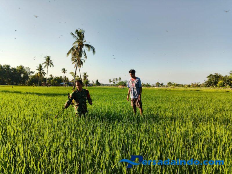 • Antisipasi Hama, Babinsa Praka Gusnanda Bantu Petani Semprot Tanaman Padi