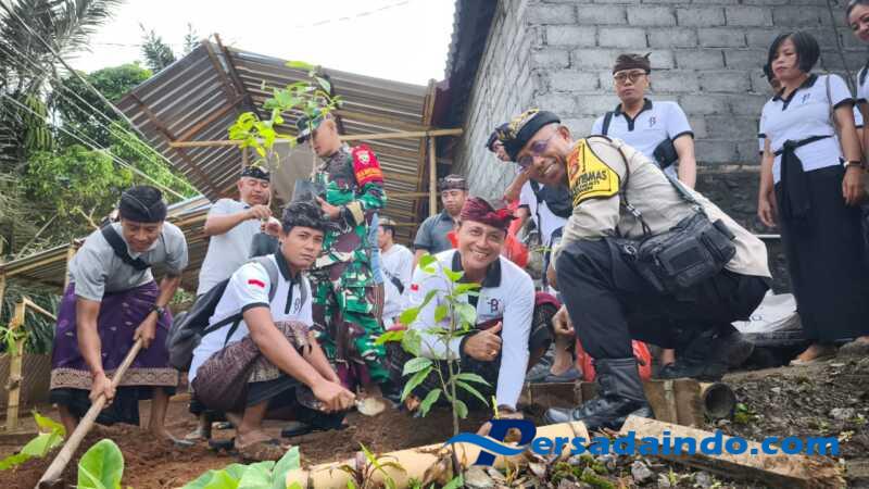 Babinsa Desa Sinduwati Koramil 1623-04/Sidemen Serda I Made Durma Yasa menghadiri kegiatan penanaman pohon di sekitaran Pura Dalem Suci Banjar Dinas Kikian, Desa Sinduwati, Kecamatan Sidemen, Kabupaten Karangasem, pada Sabtu (12/04/25).