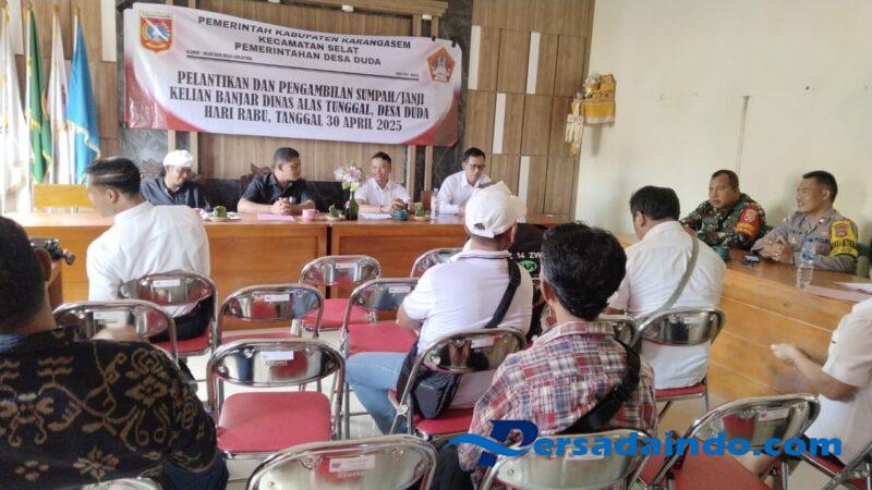 Babinsa Desa Duda Koramil 1623-06/Selat Sertu I Made Sumardika Astawa menghadiri kegiatan pelantikan dan pengambilan sumpah janji Kawil Dusun Alas Tunggal, di Aula Kantor Desa Duda Kec. Selat Kab.Karangasem, pada Rabu siang (30/04/25).