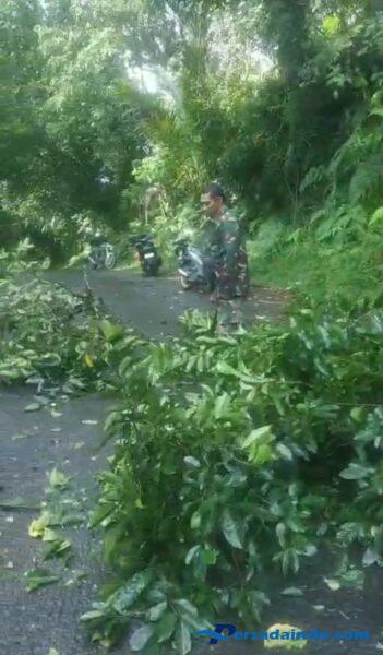 Babinsa Koramil 1623-07/Bebandem Sertu I Kadek Yulantara terjun langsung melaksanakan penanganan material tanah longsor disertai pohon tumbang, di Bjr. Dinas Liligundi, Desa Bebandem, Kecamatan Bebandem, Kabupaten Karangasem, pada Minggu (25/05/25).