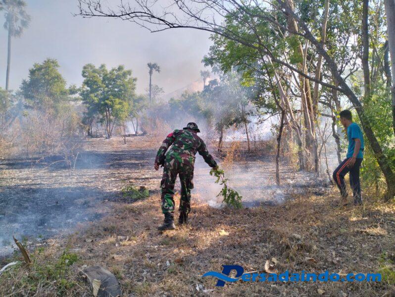 KARANGASEM – Babinsa Koramil 1623-08/Kubu Desa Sukedana Serma I Gede Putu Basma membantu proses pemadaman kebakaran lahan di Dusun Nusu, Desa Sukedana, Kec. Kubu, Kabupaten Karangasem pada Rabu (8/10/2025)
