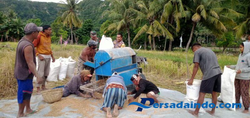 NTT Rote Ndao Babinsa Koramil 02/Pantai Baru Kodim 1627/Rote Ndao Sertu Febi Andri Muskananfola membantu petani di desa binaannya, merontokkan padi yang sudah dipanen dengan menggunakan mesin perontok padi, di lahan persawahan Fuakdale Desa Nusakdale Kecamatan Pantai Baru Kabupten Rote Ndao.