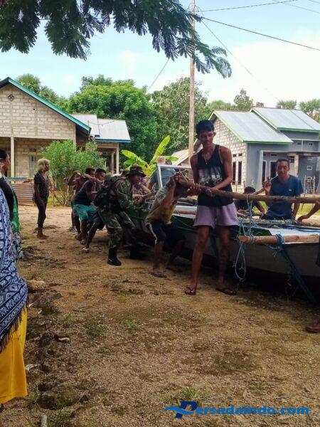 Persadaindo.com – NTT Rote Ndao Babinsa Sertu Anderson Telusa Koramil 02/Pantai Baru Kodim 1627/Rote Ndao, Menyempatkan diri untuk bersama -sama ikut membantu warga binaanya yang sedang menurunkan perahu yang bertempat di Dusun Selesai Desa Lifuleo kecamatan Rote Timur kabupaten Rote Ndao, Minggu , (4/5/2025).
