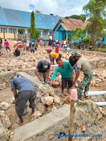 NTT Rote Ndao Anggota koramil 03/Batutua Kodim 1627/Rote Ndao Serma Yusuf Tungga bersama warga bahu membahu melaksanakan karya bakti pembuatan fondasi pembangunan rumah pelayan Gereja (Rumah Pendeta) bertempat di Desa Holulai Kec.Loaholu Kabupaten Rote Ndao .