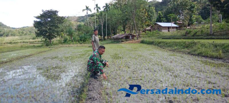 NTT-Sumba Timur, Babinsa Koramil 04/Tabundung, Kodim 1601/Sumba Timur,Sertu Ejiman mendampingi warga binaan dalam pengecekan tanaman padi yang berumur 15 hari di salah sawah Milik Bapak Komawang warga Desa Banggawatu, Kecamatan Tabundung, Kabupaten Sumba Timur, Minggu (13/07/2025)