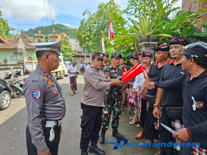 Klungkung,- Babinsa Dawan Kelod Koptu Nyoman Suartawan bersama Bhabinkamtibmas melaksanakan pendampingan penyerahan traffic baton dan helm di Desa Dawan Kelod, Kecamatan Dawan, Kabupaten Klungkung, Selasa ( 01/07/25 ).
