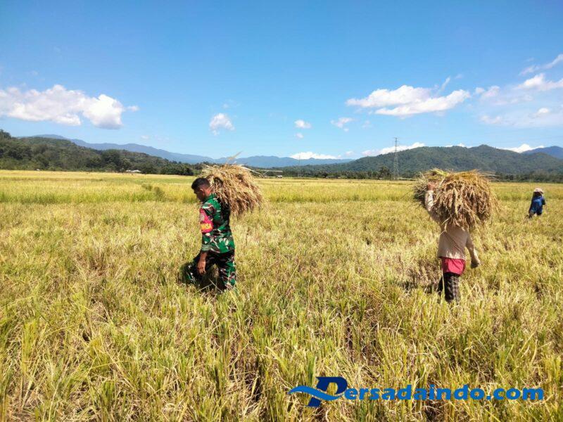 Pratu Paskalis yang merupakan Babinsa di desa tersebut ikut turun mendampingi. Ia terlihat membantu mengangkat Padi dan pengumpulkan padi tersebut.