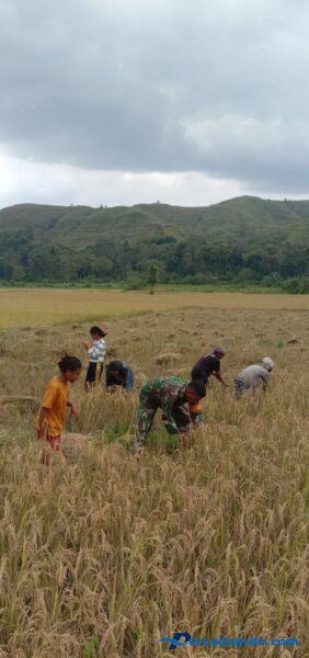 “Sebagai aparat teritorial, kami turut terjun langsung ke sawah membantu petani saat panen. Dengan menggunakan alat tradisional seperti sabit, kami berupaya meringankan beban petani serta memberi motivasi agar tetap semangat dalam bertani,” ujarnya.