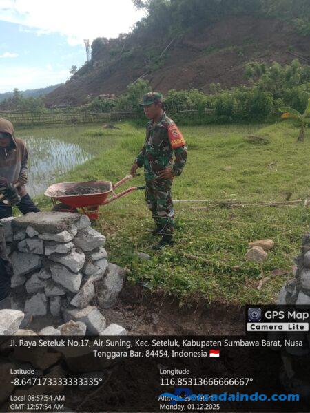 Sumbawa Barat – NTB,  Dalam upaya memastikan pembangunan di desa berjalan lancar, Babinsa Desa Air Suning, Sertu Ruslin Dari Koramil 1628-03/Seteluk aktif melaksanakan pendampingan dan pengawasan pengerjaan KDKMP pada sisi bagian belakang bangunan, Senin (01/12/2025) pukul 09.30 WITA.