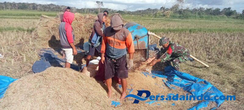 Kegiatan ini merupakan bagian dari pendampingan Babinsa terhadap petani sebagai upaya mendukung ketahanan pangan nasional. Dalam suasana penuh kebersamaan, Serka Andreas terlihat berbaur dengan para petani, membantu proses perontokan padi secara manual.