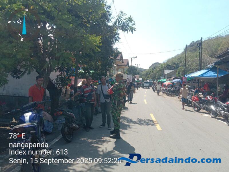 Ende, Babinsa Koramil 1602-01/Ende, Kopda Faisal Idrus, melaksanakan kegiatan Komunikasi Sosial (Komsos) dan Pengamanan Wilayah (Pamwil) di depan Warukasu Pasar Nangapanda, Kelurahan Ndorurea, Kecamatan Nangapanda, Kabupaten Ende, Senin (15/09/2025).