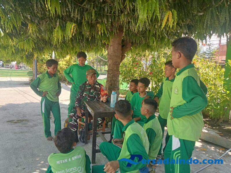 Ende, NTT – Babinsa Koramil 1602-01/Ende, Sertu Damianus Kerhi, melaksanakan kegiatan Komunikasi Sosial (Komsos) dan Pengamanan Wilayah (Pamwil) bersama para pelajar MTsN 1 Ende di Jalan Melati, Kelurahan Mautapaga, Kecamatan Ende Timur, pada Kamis (30/10/2025).