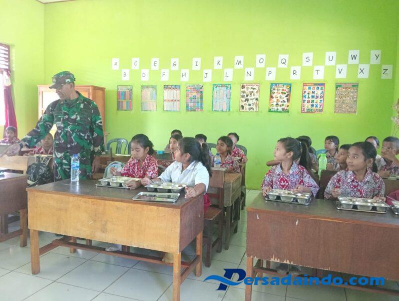 Babinsa 01/Laratama Kodim 1629/SBD, Peltu Sukrin melakukan pendampingan pembagian program Makan Bergizi Gratis (MBG) di SDN Weepangali, Kecamatan Kota Tambolaka, Kabupaten Sumba Barat Daya, Rabu (11/06/2025).