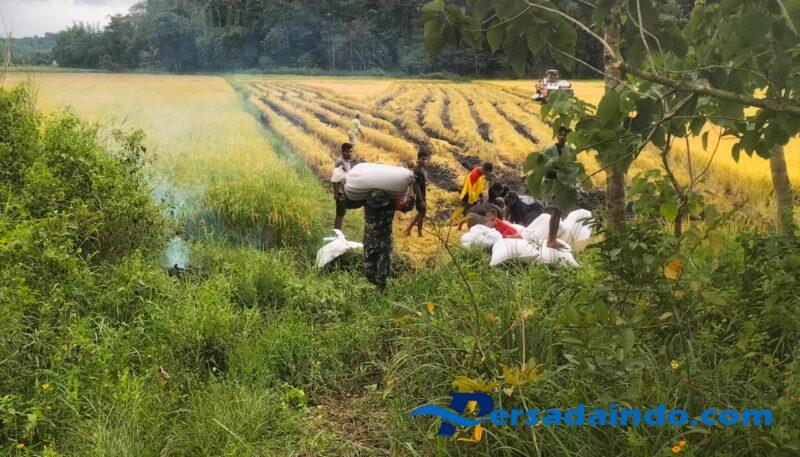 Babinsa Pratu Bethanius menuturkan, kegiatan ini merupakan bentuk kemanunggalan TNI bersama rakyat demi mewujudkan swasembada pangan nasional Babinsa turun ke lapangan membantu petani untuk mengangkut hasil panen padi untuk di jemur.