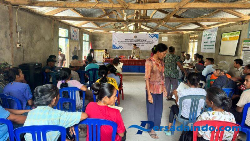 Persadaindo.com – NTT Babinsa Koramil 01/Lewa Kodim 1601/Sumba Timur Pratu Apris Hapu bersama Bhabinkamtibmas Polsek Nggoa monitoring dan pendampingan kegiatan pembagian sertifikat tanah Pendaftaran Tanah Sistematis Lengkap (PTSL) kepada warga Desa Tandula Jangga, Kecamatan Nggoa, Kabupaten Sumba Timur, Sabtu (19/04/2025)