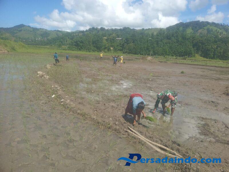 SUMBA BARAT – Wujud nyata kepedulian terhadap ketahanan pangan, Babinsa Koramil 02/Walakaka Kodim 1613/Sumba Barat Serda Yohanes Atitus turun langsung ke sawah membantu petani menanam padi di Desa Hupumada, Kecamatan Wanukaka, Kabupaten Sumba Barat, Jumat (27/6/2025).