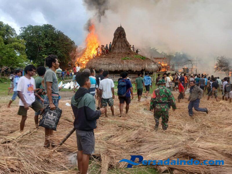 Menggunakan peralatan seadanya, Babinsa bersama warga berusaha keras memadamkan kobaran api. Material bangunan rumah adat yang sebagian besar terbuat dari kayu dan atap alang-alang membuat api cepat membesar dan sulit dikendalikan.