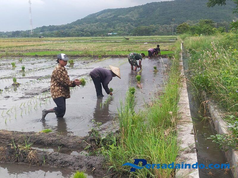 NTT-Sumba Timur,Dalam rangka mendukung ketahanan pangan dan meningkatkan produktivitas pertanian di wilayah binaannya, Babinsa Koramil 03/Pahunga Lodu Kodim 1601/Sumba Timur, Serda Hendrik Hati Waluandja, turut serta membantu para petani dalam kegiatan tanam padi musim kedua (MT2) di Desa Wulla, Kecamatan Wulla Waijelu, Kabupaten Sumba Timur, pada Jumat (13/06/2025).