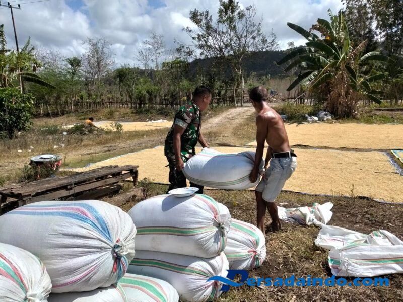 NTT-Sumba Timur. Wujud nyata kepedulian terhadap masyarakat binaannya, Babinsa Koramil 03/Pahunga Lodu Kodim 1601/Sumba Timur, Serda Hendrik Hati Waluandja, turun langsung membantu petani menjemur padi di Desa Wulla, Kecamatan Wulla Waijelu, Kabupaten Sumba Timur, Rabu (24/09/2025).