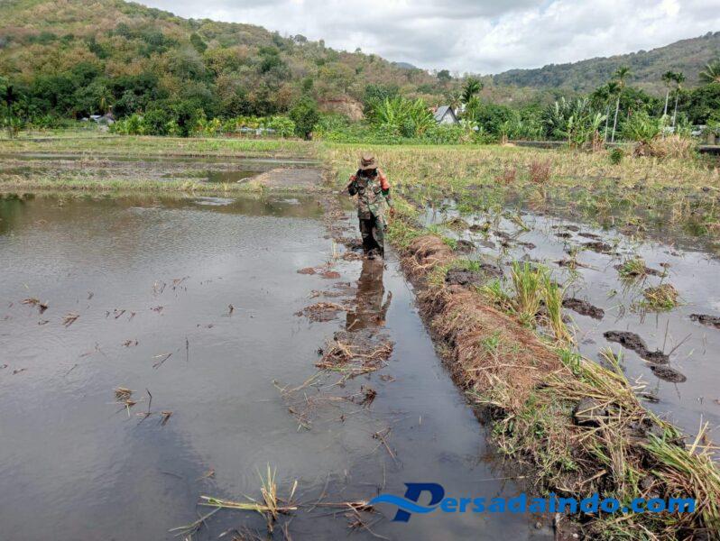 Pematang sawah yang rusak akibat hujan deras beberapa waktu lalu membuat aliran air tidak terkontrol, serta mengganggu proses pengolahan lahan dan penanaman padi milik petani. Melihat kondisi tersebut, Babinsa langsung berinisiatif membantu warga memperbaiki kerusakan dengan alat seadanya.