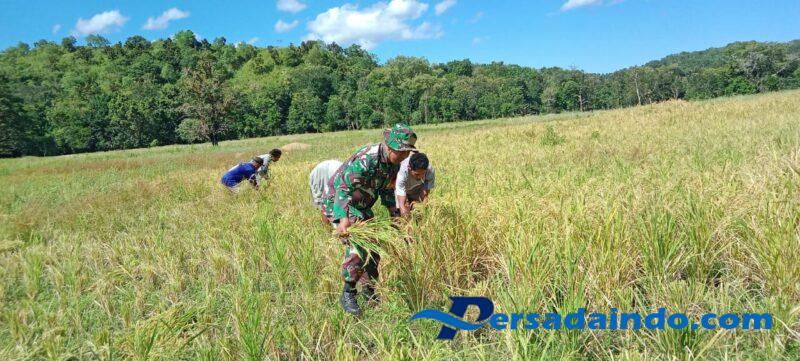 NTT- Sumba Timur, Bentuk kepedulian TNI terhadap masyarakat kembali ditunjukkan oleh Bintara Koramil 04/Tabundung, jajaran Kodim 1601/Sumba Timur, Sertu Ejiman, yang turun langsung membantu petani dalam kegiatan panen padi di Desa Wudipandak, Kecamatan Tabundung, Kabupaten Sumba Timur, pada Rabu (28/05/2025).