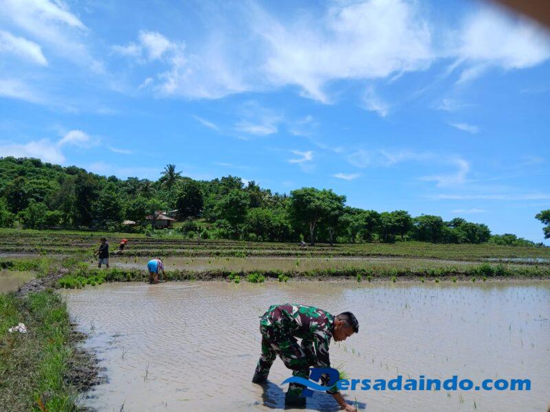 NTT – Sumba Timur. Babinsa Koramil 04/Tabundung jajaran Kodim 1601/Sumba Timur, Pratu Denis Deru Peta, melaksanakan pendampingan ketahanan pangan (Hanpangan) dengan turun langsung ke sawah membantu petani menanam padi di Desa Bangga Watu, Kecamatan Tabundung, Kabupaten Sumba Timur, Selasa (11/11/2025).