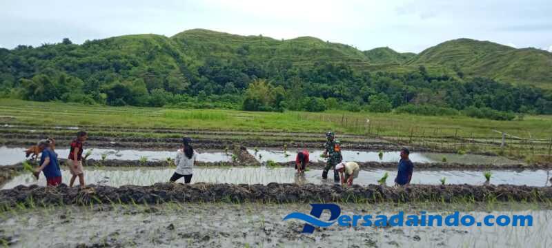 Persadaindo.com Babinsa Koramil 04/Tabundung Kodim 1601/Sumba Timur Sertu Ejiman melaksanakan pendampingan kepada petani menanam padi di sawah milik Bapak Melkianus warga Desa Karita, Kecamatan Tabundung Kabupaten Sumba Timur, Rabu (09/04/2025).