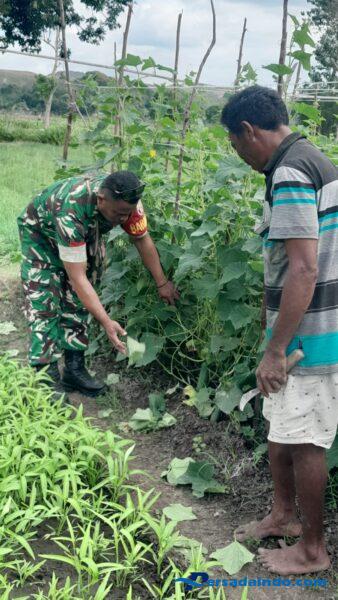 NTT – Sumba Timur, Babinsa Koramil 05/Waingapu jajaran Kodim 1601/Sumba Timur, Koptu Mukmin Matoke melaksanakan pemantauan perkembangan perawatan Tanaman mentimun milik bapak Ferdi di Kelurahan Mauliiru, Kecamatan Kambera, Kabupaten Sumba Timur, Selasa (01/07/2025)