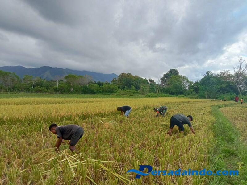 Kegiatan ini merupakan bentuk kepedulian TNI terhadap para petani di wilayah binaannya. Sertu Ferdinan bersama para petani memanen padi secara bergotong royong di sawah milik warga setempat.