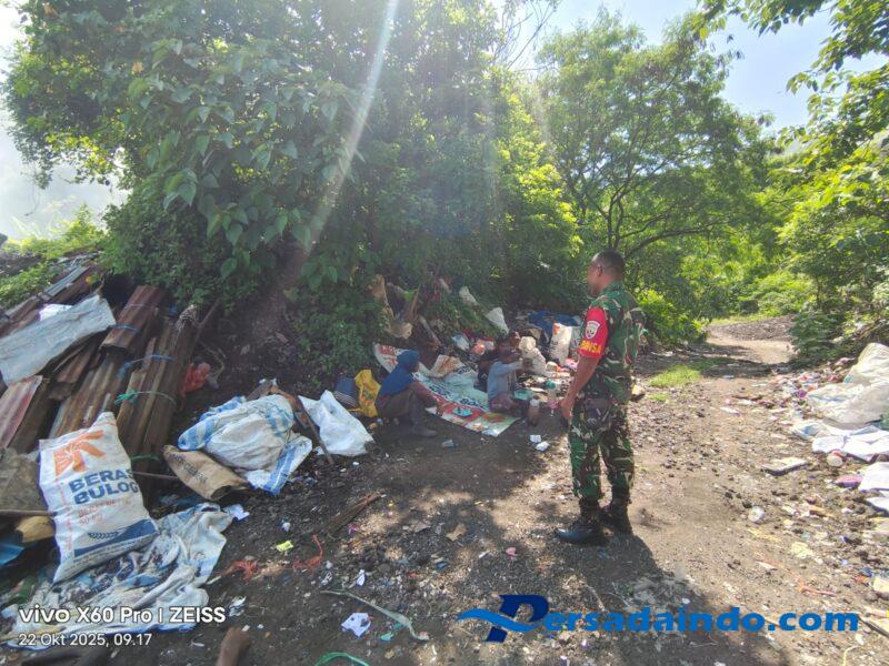 Ende, Babinsa Koramil 1602-01/Ende, Serma Nasrudin Latif, melaksanakan kegiatan komunikasi sosial (Komsos) dan pengamanan wilayah (Pamwil) bersama para pemulung yang bekerja di Tempat Pembuangan Akhir (TPA) Rate, Kelurahan Tanjung, Kecamatan Ende Selatan, Kabupaten Ende.
