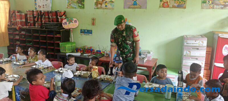 Ende, Dalam rangka mendukung program pemerintah terkait penyediaan makan siang bergizi bagi anak-anak sekolah, Babinsa Koramil 1602-01/Ende, Praka Taruna Diharjaya DE, turut berpartisipasi dalam kegiatan pembagian makanan bergizi gratis di TK Kartika Kusuma Udayana VII-10 Kompi C, Kelurahan Paupire, Kecamatan Ende Tengah, Kabupaten Ende.
