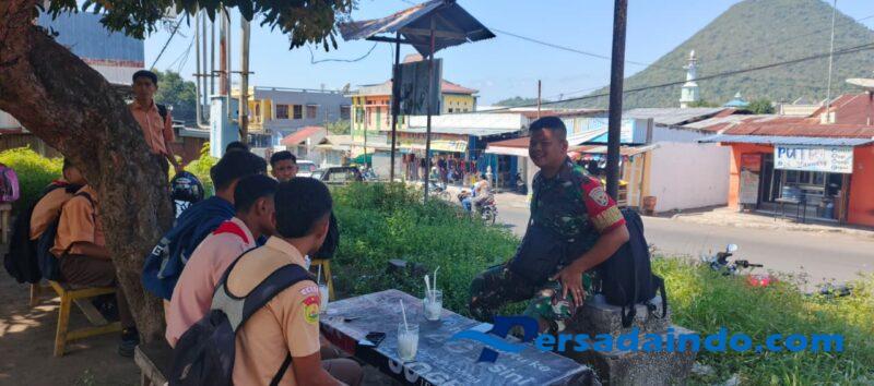 Ende, Babinsa Koramil 1602-01/Ende, Praka Taruna Diharjaya DE, melaksanakan kegiatan komunikasi sosial (Komsos) dan pemantauan wilayah (Pamwil) dengan pelajar di Jalan Kelimitu, Kecamatan Ende Tengah, Kabupaten Ende. Kegiatan ini bertujuan memberikan motivasi sekaligus menjaga keamanan dan ketertiban di lingkungan sekolah.