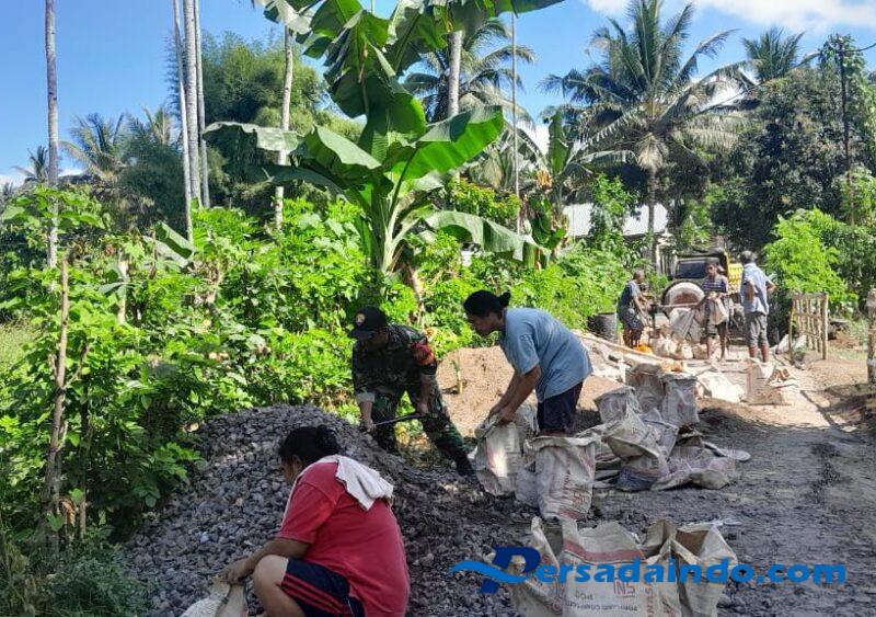Dengan semangat gotong royong, masyarakat Desa Nita bersama Sertu Benendito dan anggota Koramil 1603-01/Alok bahu-membahu melaksanakan pengecoran jalan setapak.