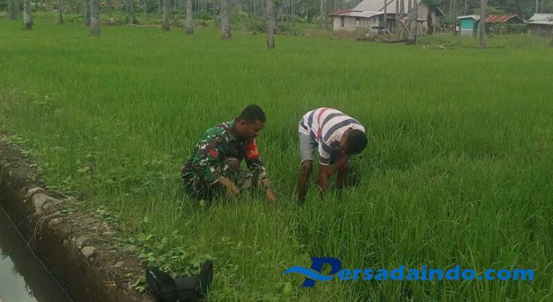 NTT-SIKKA Babinsa Koramil 1603-02/Talibura Kodim 1603/Sikka Praka Mansyur melaksanakan kegiatan pembersihan rumput liar pada tanaman padi bersama masyarakat Desa Talibura, Kecamatan Talibura, Kabupaten Sikka, Senin(16/06/2025).
