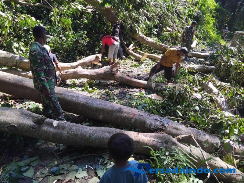 NTT-SIKKA Babinsa Koramil 1603-03/Paga Kodim 1603/Sikka, Serda Nelson dan Praka Bachrudin Amir, bersama masyarakat melaksanakan gotong-royong pembersihan pohon tumbang akibat curah hujan dan angin kencang di Desa Kowi, Kecamatan Paga, Kabupaten Sikka, Minggu(06/07/2025).