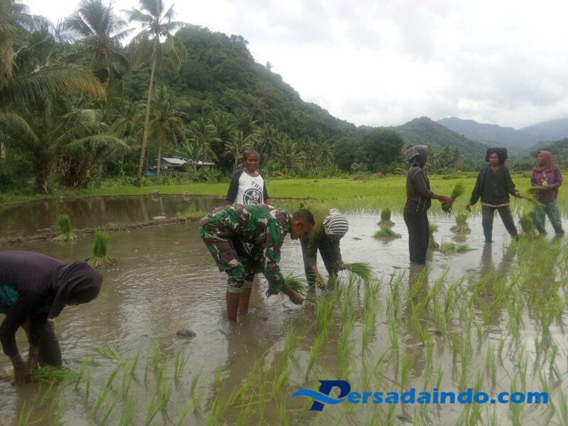 NTT-SIKKA. Babinsa Koramil 1603-03/Paga, Pratu Eman Manehat, melaksanakan penanaman padi bersama masyarakat Desa Bhera, Kecamatan Mego, Kabupaten Sikka, Senin(12/052025).