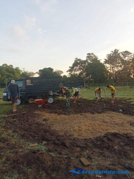 NTB – Sumbawa, Dalam semangat kebersamaan dan kepedulian terhadap lingkungan, Babinsa Koramil 1607-04/Alas, Serda Toni J, bersama warga Desa Tarusa, Kecamatan Buer, melaksanakan kegiatan gotong royong membersihkan lapangan sepak bola desa setempat, Senin (9/6/25).