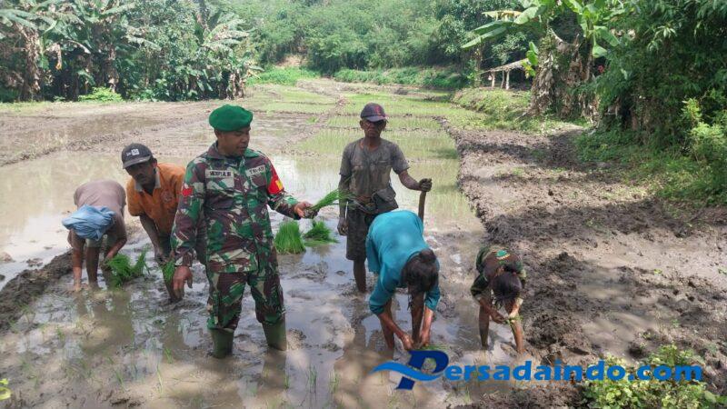 NTT-Kefamenanu, Jumat 11 Juli 2025, Meski kaki tenggelam dalam lumpur sawah, semangat tak pernah lelah, Bersama Rakyat, langkah tetap terarah, Kebersamaan dan semangat gotong royong kembali terlihat saat Kopka Miguel Ameida Bire, Babinsa Koramil 1618-02/Miobar, Setempat turut serta membantu para petani menanam padi di sawah, di Wilayah binaan Desa Tasinifu, Kec. Mutis, Kab. TTU. Kegiatan ini menjadi momen yang penuh makna, tidak hanya mempererat hubungan antara TNI dan Masyarakat, tetapi juga menjadi wujud nyata dukungan terhadap ketahanan pangan Nasional.