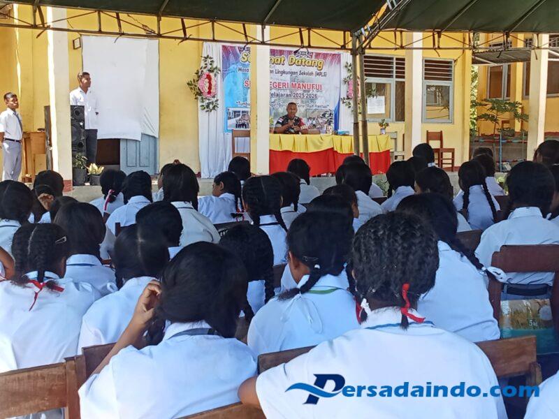 TTU-Kefamenanu, Rabu, 16 Juli 2025., Suasana berbeda terlihat di halaman SMA Negeri Manufui, Desa Supun, Kec. Biboki Selatan, Kab. TTU., Dalam rangka kegiatan Masa Pengenalan Lingkungan Sekolah (MPLS), dua personel Babinsa dari Koramil 1618-04/Bisel, yakni Serka Legius Ludji Leo dan Sertu Wilfridus Molo, hadir memberikan materi pembentukan karakter kebangsaan kepada para siswa baru.