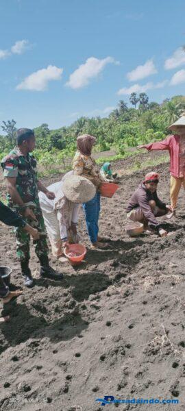 Bertempat di RT 07 RW 03 Dusun Daehuti, Desa Matanae, Kecamatan Rote Timur, Kabupaten Rote Ndao, Sertu Camilo turun langsung ke lahan pertanian milik Bapak Bea Claas yang tergabung dalam Kelompok Tani Roki, guna membantu proses penanaman bawang.