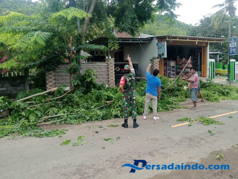 Bersama Kepala Dusun Sawe Baru, Serda Adi Putra mengarahkan warga setempat untuk melakukan pemotongan dan pembersihan dahan pohon yang berada di pinggir jalan raya. Dahan-dahan yang rawan patah tersebut dinilai berpotensi menimbulkan bahaya bagi pengguna jalan maupun warga sekitar.