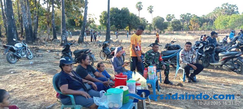 NTT-KUPANG, – Babinsa Kuanheun Koramil 1604-06/Batakte, Sertu Ruben A. Tiumlafu bersama Bhabinkamtibmas Desa Kuanheun melaksanakan pengamanan jalannya pertandingan sepak bola mini dalam ajang Kades Cup 4. Kegiatan ini digelar dalam rangka menyambut Hari Ulang Tahun ke-80 Kemerdekaan Republik Indonesia tahun 2025. Kamis (10/07/2025).