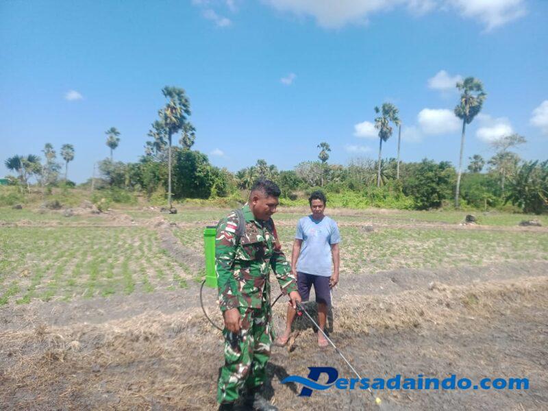 Rote Ndao – Babinsa Koramil 1627-03/Batutua membantu petani menyemprot gulma lahan yang akan di tanami sayur mayur di Desa Oebou Kecamatan Rote Barat Daya Kabupaten Rote Ndao.Senim (4/08/2025).