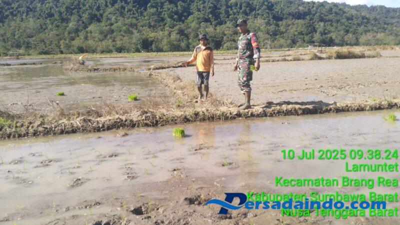 Sumbawa Barat, NTB- Koramil 1628-01/Taliwang Sumbawa Barat Babinsa Desa Lamuntet sertu irwansyah, melaksanakan pendampingan menanaman padi di Desa Lamuntet kecamatan Brang Rea Kabupaten Sumbawa Barat, Kamis (10/07/2025).