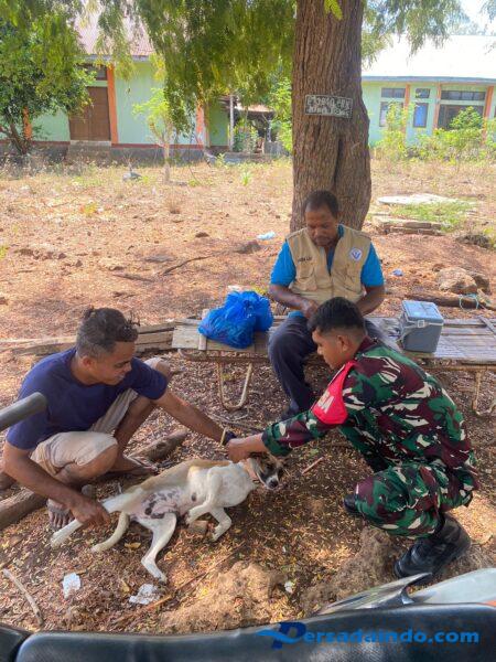 Nagawutung, Lembata – Babinsa Koramil 1624-07/Nagawutung, Pratu Elias Antonio Wadu Lay, turut mendampingi petugas Dinas Peternakan dalam kegiatan vaksinasi rabies bagi hewan peliharaan, khususnya anjing dan kucing, yang dilaksanakan di Desa Duawutun, Kecamatan Nagawutung, Kabupaten Lembata, Senin (25/8/2025).